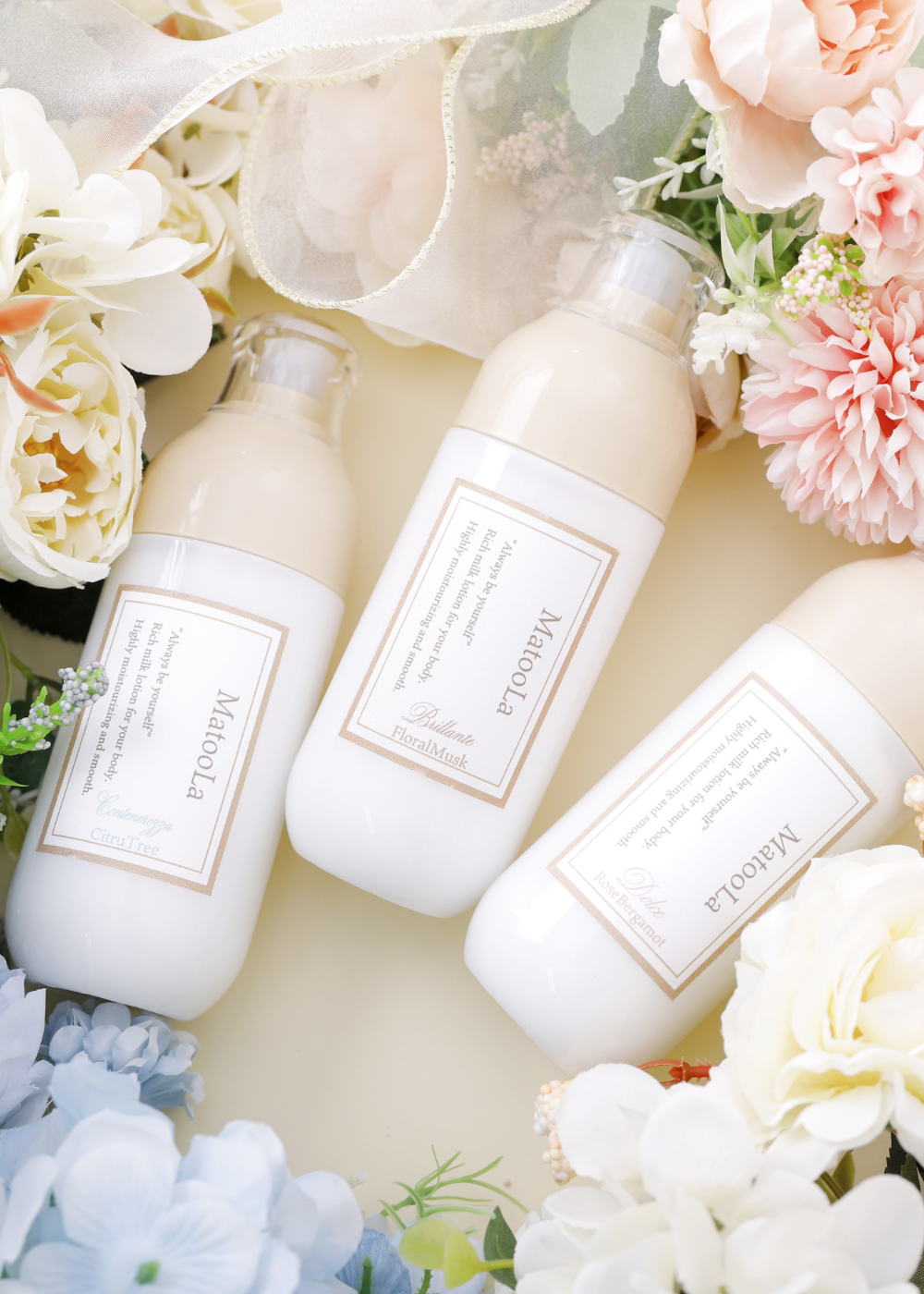 4種のブレンドオイルとベースの美容成分エイジングケア成分にこだわった美容液ボディミルクです。